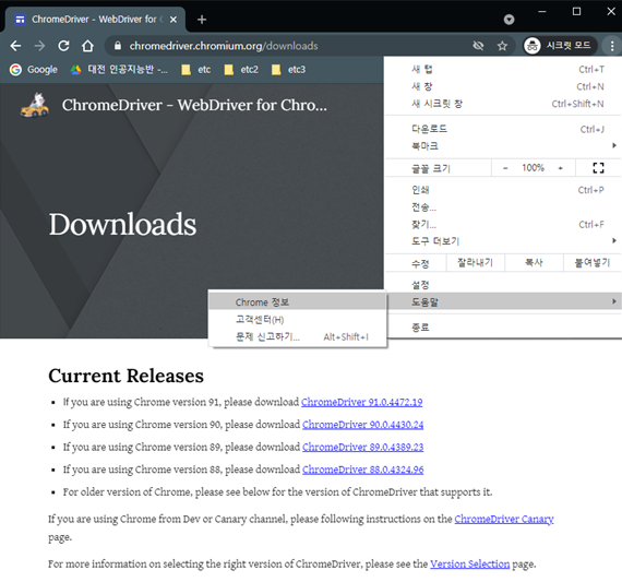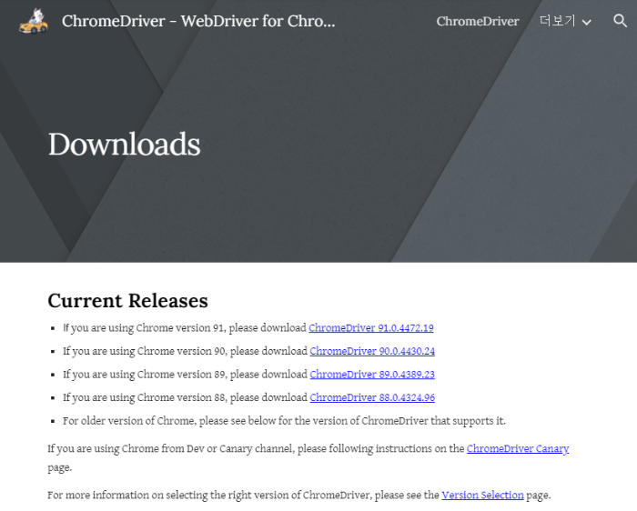 크롬 드라이버의 버전이 여러 가지로 나뉘어 있습니당