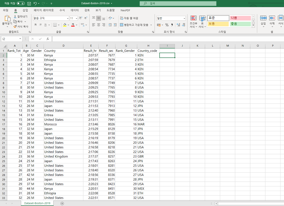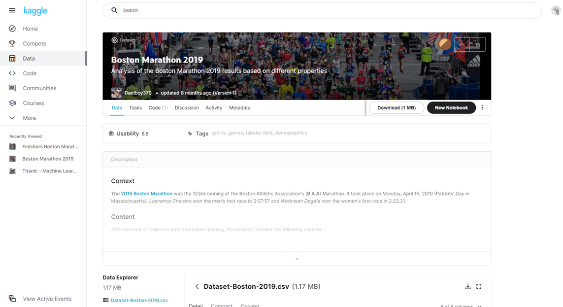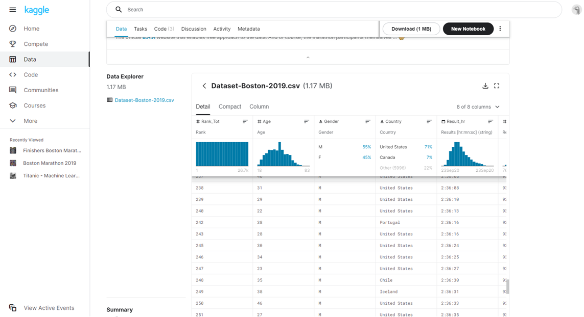 캐글에 검색해보니 Boston Marathon 2019 데이터가 있어서 복습도 할 겸 전처리와 시각화를 해보려고 합니다.